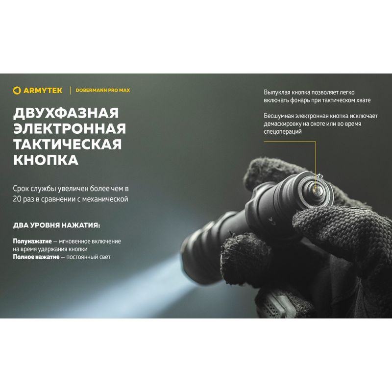 Ліхтар Armytek Dobermann Pro v4 MAX — це тактичний ліхтар у компактному корпусі з авіаційного алюмінію високого ступеня твердості з можливістю повсякденного використання. Модель має вражаючі для такого розміру характеристики сили світла, а промінь з чіткою центральною плямою висвічує об'єкти, що знаходяться на значній відстані. Тепер уже наявність двох кнопок керування забезпечує швидкий доступ до необхідних режимів під час використання ліхтаря як ручного.