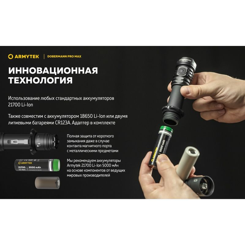 Dobermann Pro Max сумісний зі спеціально розробленою магнітною виносною кнопкою MRS-02C і оригінальними кріпленнями для підствольного застосування. Модель працює не тільки на комплектному елементі живлення, але й на будь-якому стандартному акумуляторі 21700 Li-Ion, а також завдяки адаптеру на акумуляторі 18650 Li-Ion. Варіативність елементів живлення дозволяє значно підвищити автономність.