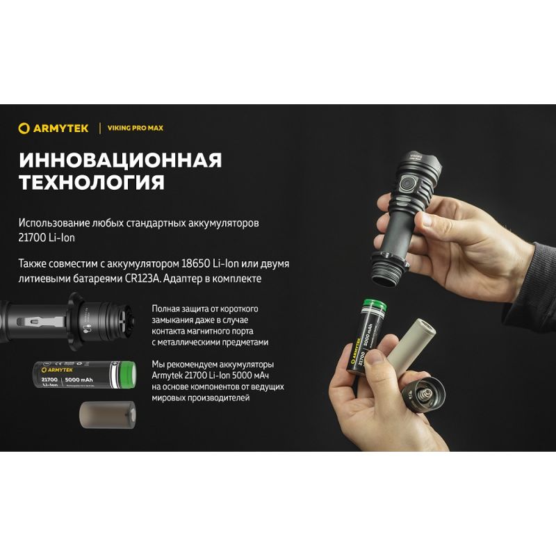 - Сумісність з елементами живлення різних типорозмірів: ліхтар працює на одному стандартному акумуляторі 21700 Li-Ion або 18650 Li-Ion, а також на двох літієвих батареях CR123A.