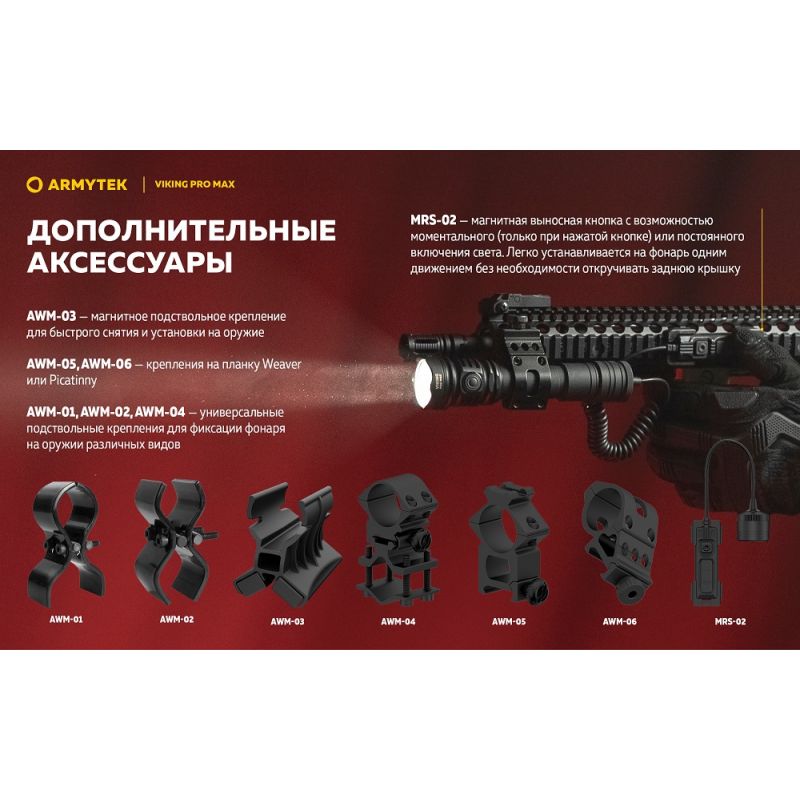 Модель сумісна зі спеціально розробленою магнітною виносною кнопкою (MRS-02) та оригінальними кріпленнями для підствольного застосування. Ліхтар працює не тільки на комплектному елементі живлення, але і на будь-якому стандартному акумуляторі 21700 Li-Ion, а також завдяки адаптеру на акумуляторі 18650 Li-Ion або на двох літієвих батарейках CR123A. Варіативність елементів живлення дозволяє значно підвищити автономність.