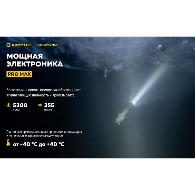 - Pro Max Електроніка нового покоління забезпечує вражаючу дальність 355 метрів і яскравість 5300 люмен. Постійна яскравість світла навіть при температурі -40 °C і не повністю зарядженому акумуляторі.